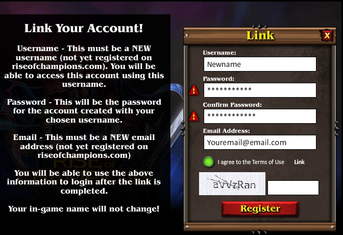 - IMPORTANT - In this window you are creating a NEW username and password to access this very account at https://riseofchampions.com